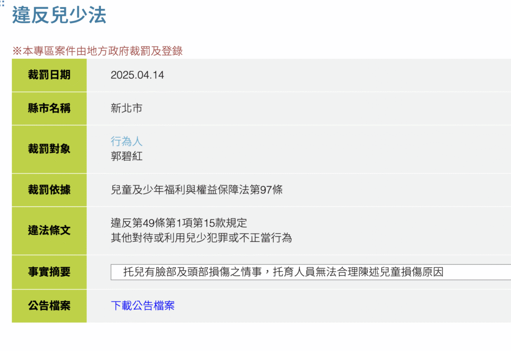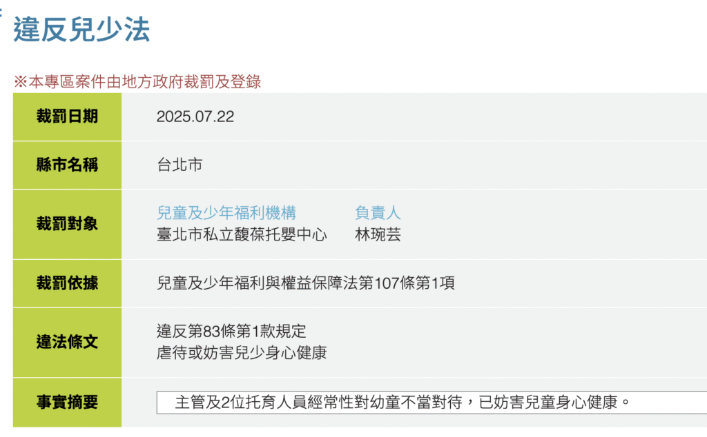 衛生福利部違反兒少法查詢:https://crc.sfaa.gov.tw/ChildYoungLaw/Sanction